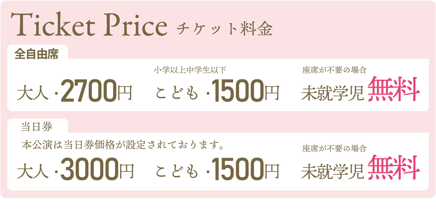 本公演は座席不要の「未就学児」の場合のみ入場無料となっております。座席が必要な場合は未就学児の場合もこどもチケットをお求めください。