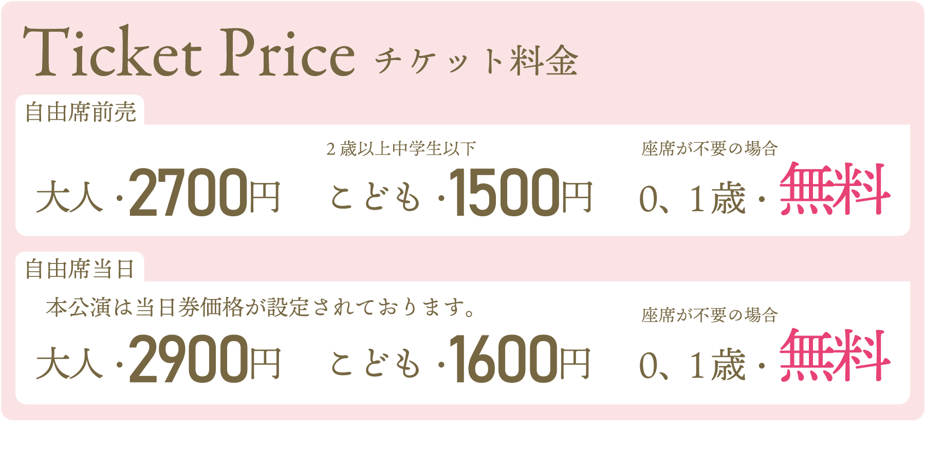 ・公演中赤ちゃんが泣いてしまってもそれも音楽の一部です♪ただ、赤ちゃんがつらい状態であることは私共も望んでおりませんので、演奏中であっても出入りOKですのでロビーで休憩しながら楽しくご鑑賞下さい。